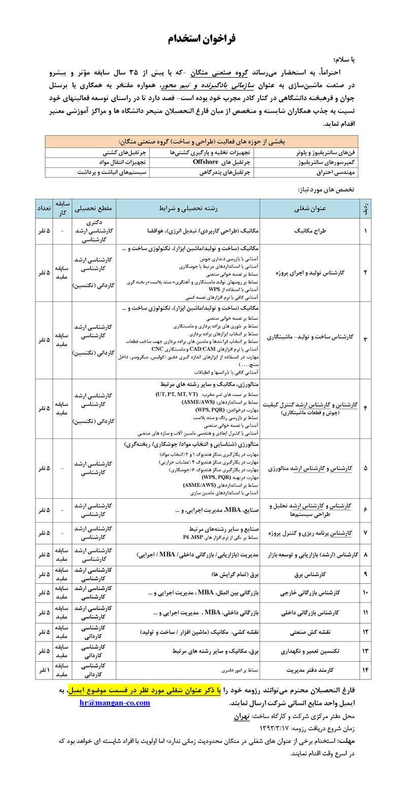 مهندسین مشاوری جهت پروژه های نفت، گاز و پالایشگاهی به کارشناس با تخصص های ذیل نیاز دارد: